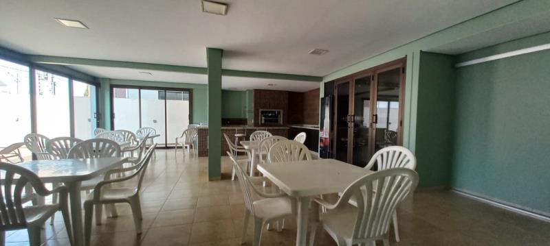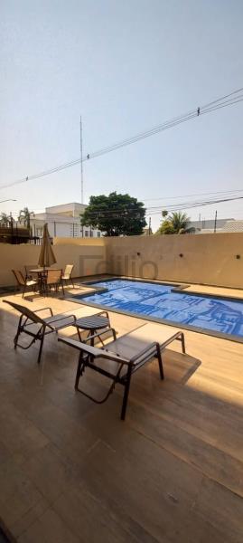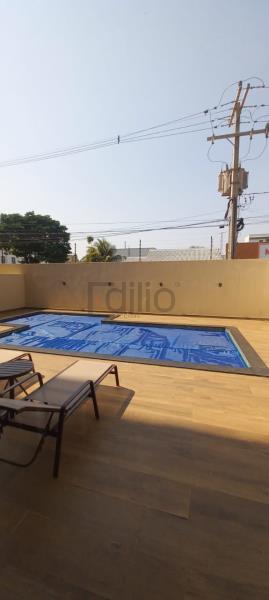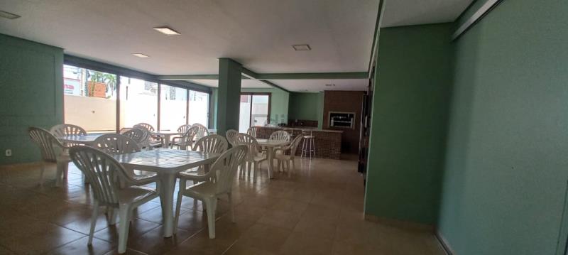 Edifício com piscina e salão de festas.